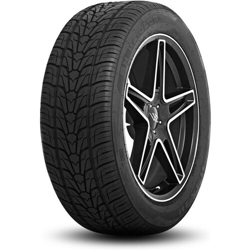 The Nexen Roadian HP tire is an SUV and light truck high performance SUV tire for enhanced performance and grip on multiple surfaces. Cornering grip and stability are maximized by the large shoulder blocks while handling is improved by the arrow-type center rib and directional tread pattern. The 5-pitch variation in the tread blocks reduces pattern noise while the wide deep grooves offer superb water evacuation from under the tires for better braking and anti-hydroplaning on wet roads.